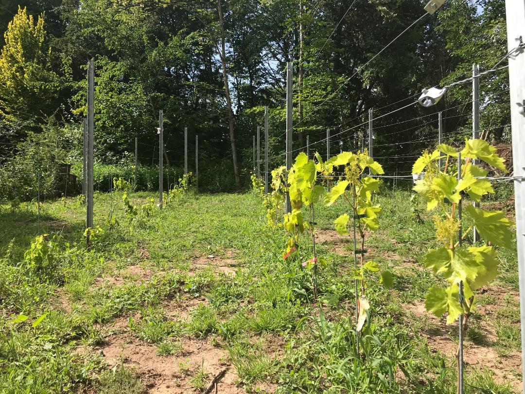Die Entscheidung, an diesem Mini-Hang einen Weingarten anzulegen, habe ich nach den extrem trockenen Sommern 2018 und 2019 getroffen. Rebstöcke, die man in einem Abstand von nur 80cm pflanzt, wurzeln wesentlich tiefer durch den nachbarlichen Wurzeldruck. Darum wird der Weingarten nie bewässert. Die Trockenheits- toleranten Unterlagen stammen aus Südfrankreich.